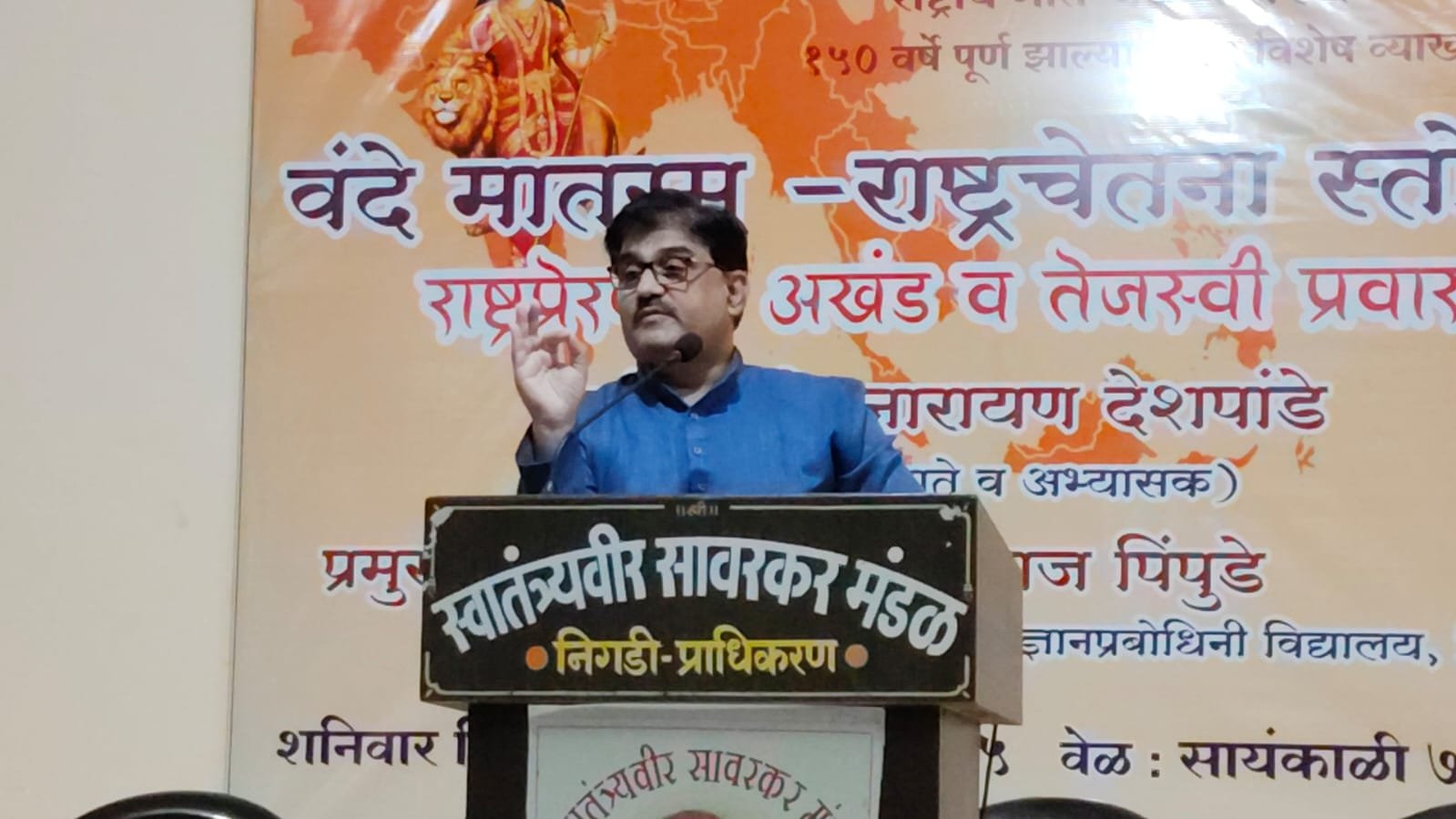 पिंपरी (१६ नोव्हेंबर २०२५) : “बंकिमचंद्र चटोपाध्याय हे भारतीय राष्ट्रीय विचारप्रवाहाचे मूळ प्रेरणास्थान आहेत. ‘वंदे मातरम्’ या गीताने त्यांनी भारतीयांच्या मनात राष्ट्रप्रेमाची तेजस्वी ज्योत चेतवली!” असे प्रतिपादन अभ्यासक नारायण देशपांडे यांनी केले. स्वातंत्र्यवीर सावरकर मंडळाच्या वतीने ‘वंदे मातरम्’ या गीताला १५० वर्षे पूर्ण झाल्यानिमित्त (Vande Mataram-150)