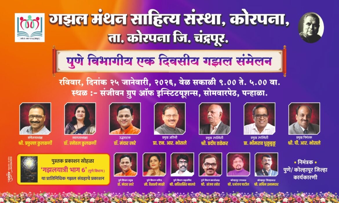 पुणे : प्रतिनिधी:गझल मंथन साहित्य संस्था, कोरपना यांच्या वतीने रविवार, दि. २५ जानेवारी २०२६ रोजी एकदिवसीय गझल संमेलनाचे आयोजन करण्यात आले आहे. हे संमेलन सोमवारपेठ, पन्हाळा येथील संजीवन अभियांत्रिकी महाविद्यालयात संपन्न होणार (Ghazal Sammelan) आहे.