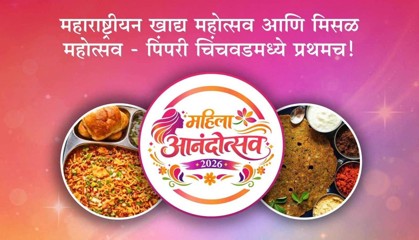 पिंपरी-चिंचवडमध्ये १४ व १५ मार्च रोजी ‘महिला आनंदोत्सव २०२६’चे आयोजन. भव्य मिसळ महोत्सव, नृत्य स्पर्धा, संगीत कार्यक्रम, खरेदी स्टॉल्स आणि विविध सांस्कृतिक उपक्रमांचा जल्लोष; हजारो महिलांचा सहभाग अपेक्षित.