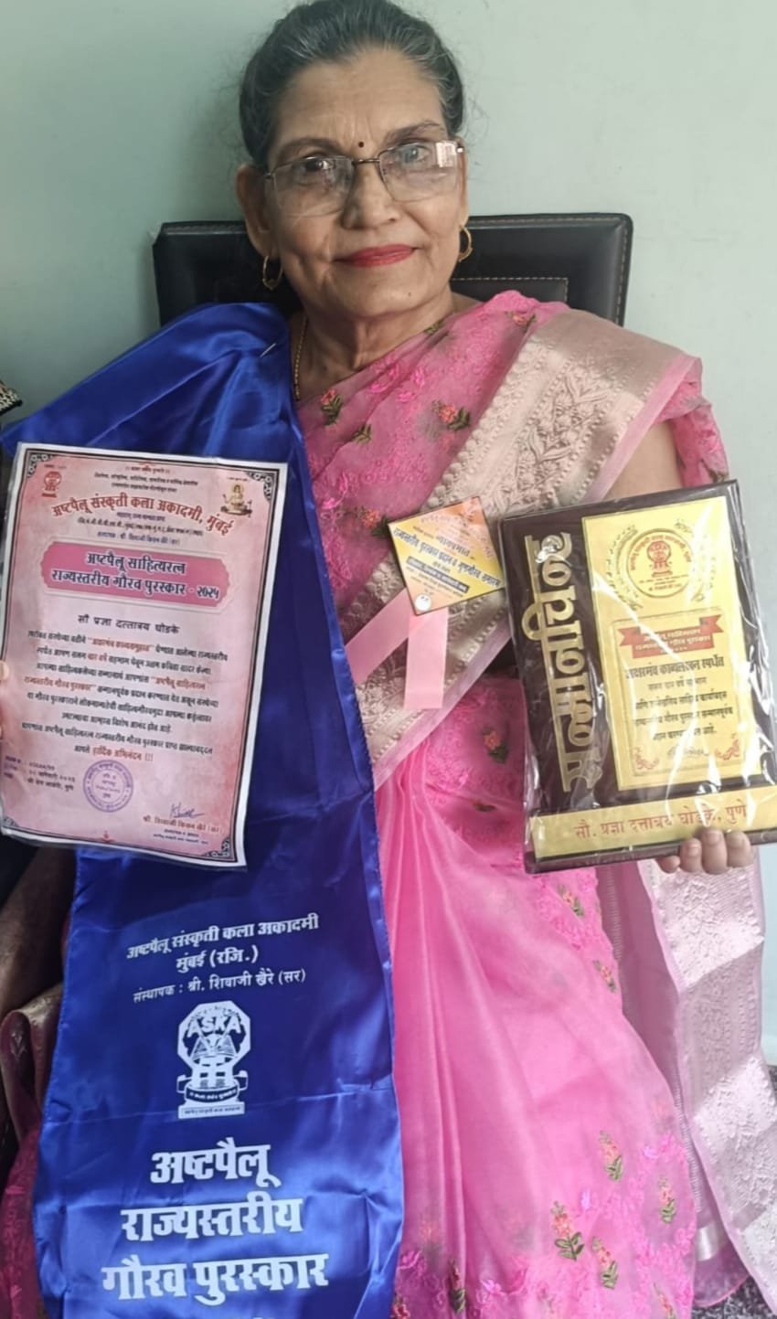 चिंचवड – अष्टपैलू संस्कृती कला अकादमी, मुंबई यांच्या वतीने पिंपरी-चिंचवड येथील ज्येष्ठ साहित्यिका सौ. प्रज्ञा घोडके यांना ‘साहित्यरत्न’ पुरस्काराने सन्मानित करण्यात आले. प्रकृती अस्वास्थ्यामुळे त्या समारंभाला उपस्थित राहू शकल्या नाहीत. त्यामुळे संस्थेतर्फे सन्मानचिन्ह, मानपत्र आणि गौरववस्त्र कुरिअरद्वारे त्यांच्या निवासस्थानी पाठविण्यात (Sahitya Ratna Award) आले.