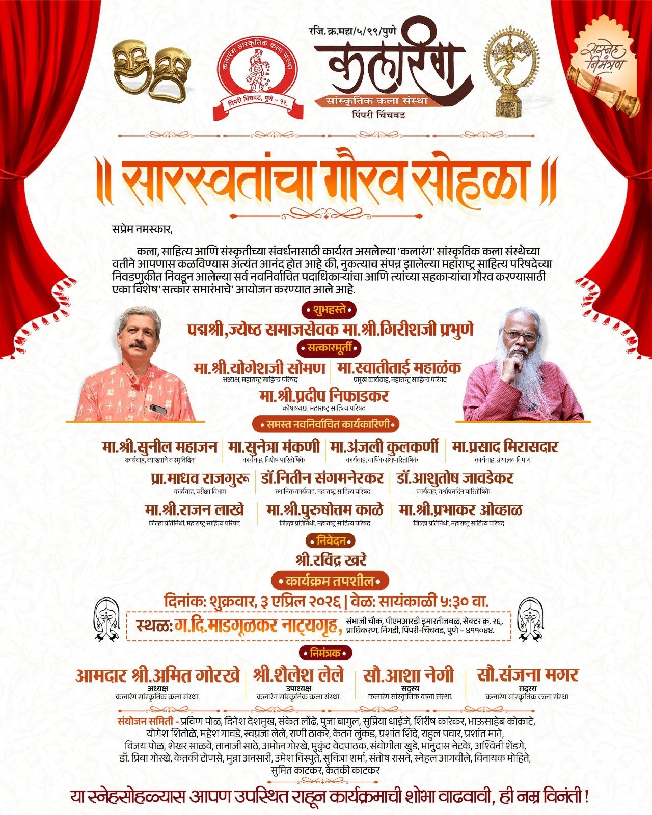 कार्यक्रमात विविध विभागांचे कार्यवाह आणि जिल्हा प्रतिनिधींचाही गौरव होणार असून, निवेदनाची जबाबदारी रविंद्र खरे यांच्याकडे असणार(Kalarang PCMC) आहे.